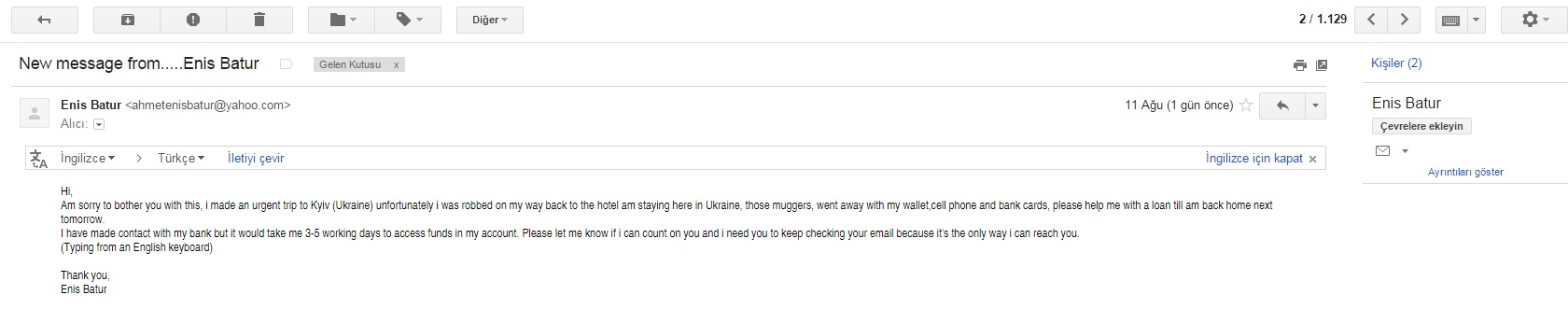 Enis Batur’un adı kullanılarak yazılan İngilizce maillerde “Kiev’de soyuldum. Cüzdanımı, cep telefonumu ve banka kartlarımı çaldılar” deniliyor. Mailde, bankayla iletişime geçmeye çalışıldığı ancak yeni hesap için birkaç gün gerektiği söyleniyor ve “borç” isteniyor.