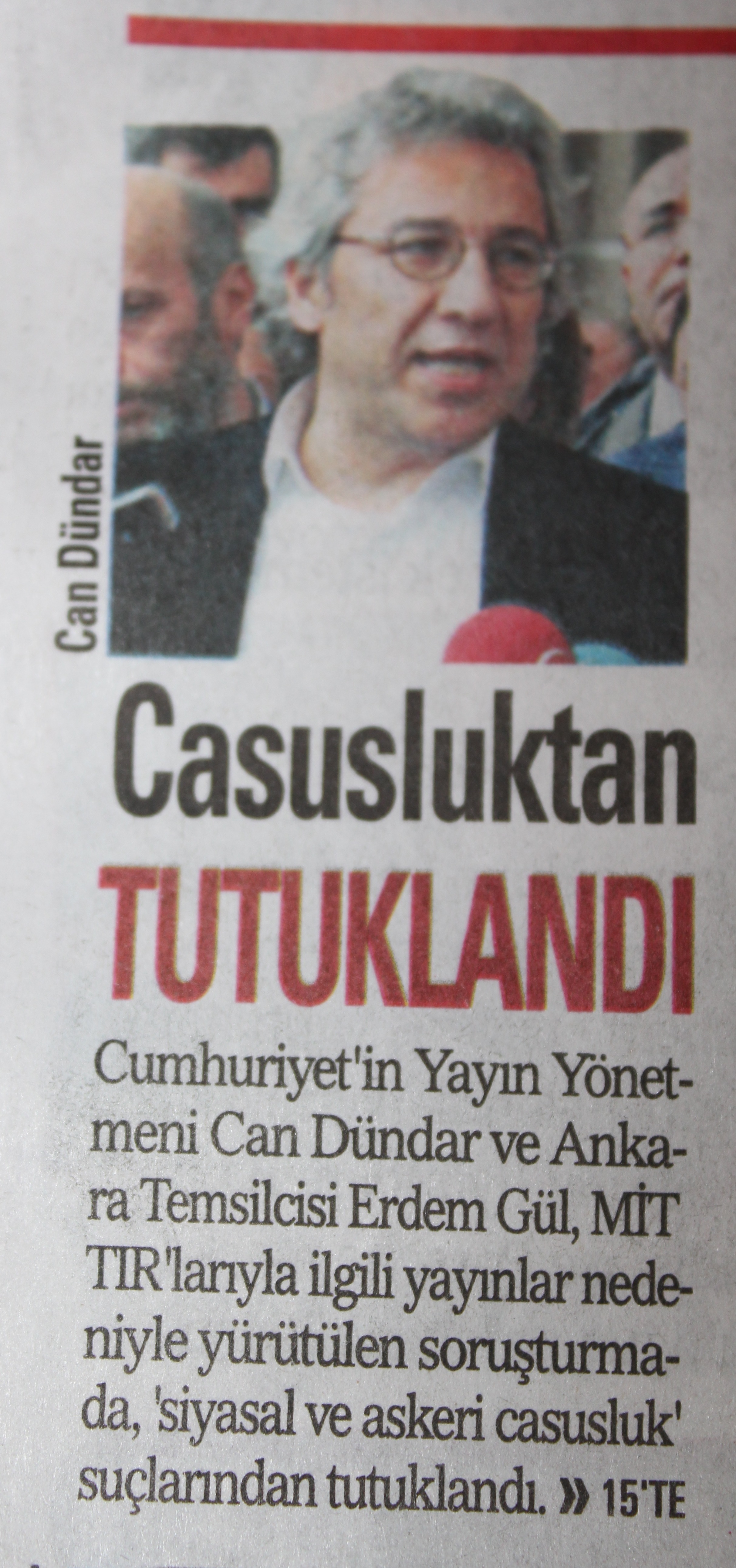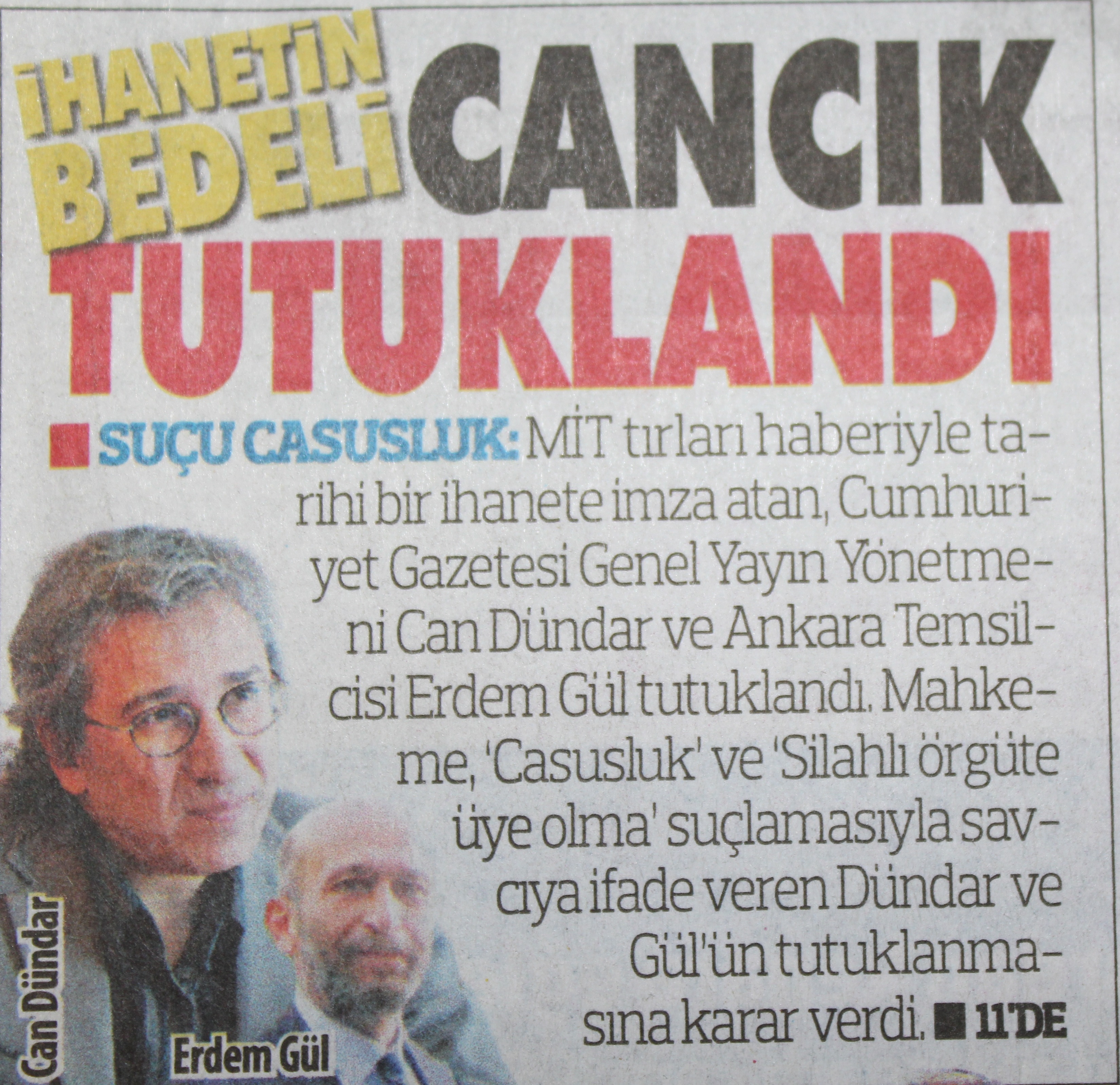 Peki Türkiye’de 2 gazetecinin habercilik yaptıkları için tutuklanmasını birinci sayfalarında kibrit kutusu kadarcık görebilen gazetelere ne diyeceğiz? Hadi Vatan’dan beklenti zaten yok. Ama Can Dündar’ın 12 yıl boyunca yazı yazdığı Milliyet’te bu haber birinci sayfada kibrit kutusu kadarcık bir yere mi sıkıştırılmalıydı? Tapelerdeki yersiz yakarışlar, koca birinci sayfada bu mühim haber için yersiz kalmayı da açıklıyor olsa gerek.