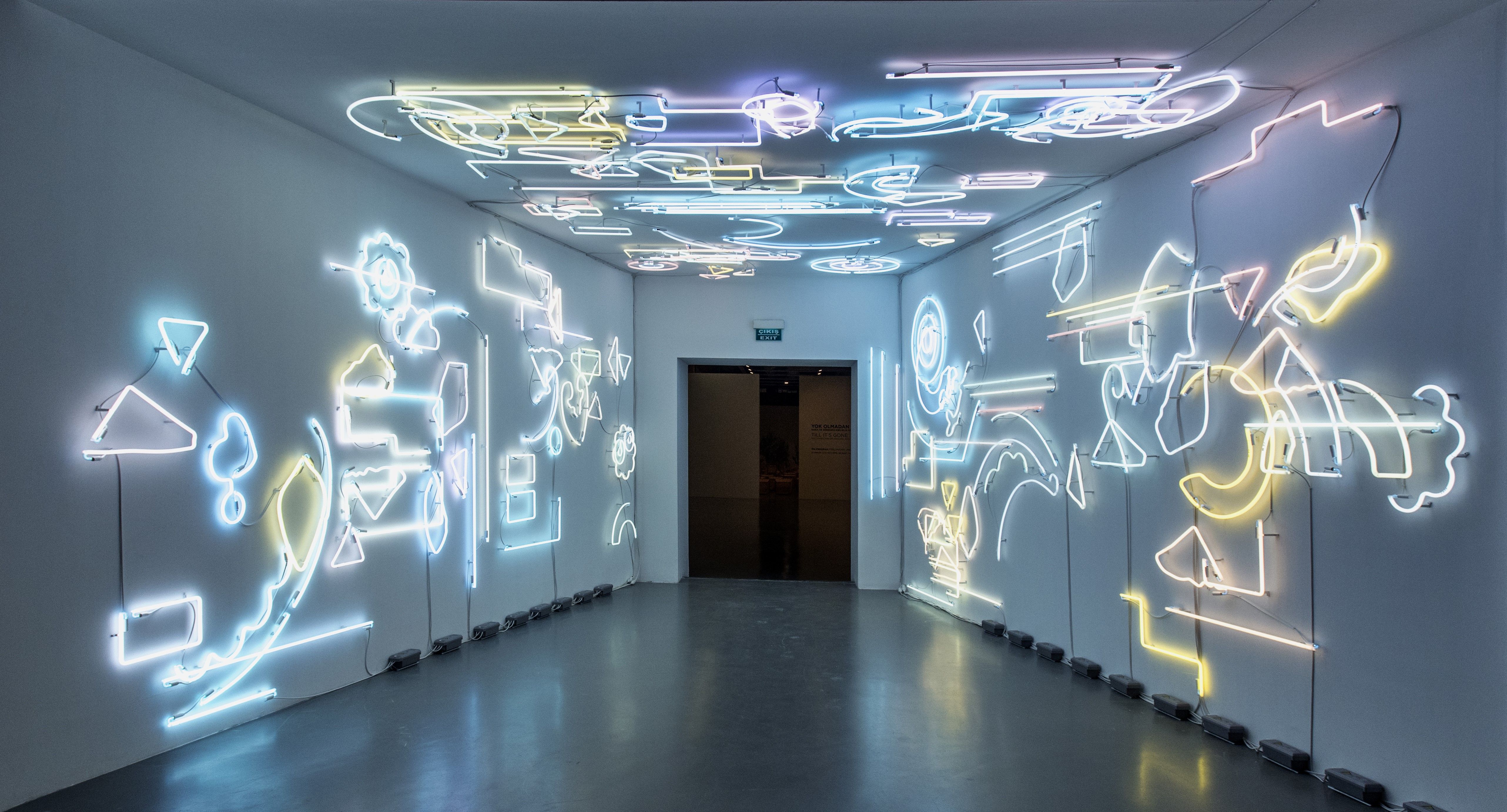 İkinci kapıdaki ise Pae White’ın son derece iyimser bir çalışması. Sergiye giriş ya da çıkışta kullanılacak bir kanal alanı ve mekana özgü neon ışıkları. Bu ışık terapisi etkisi gösteriyor. Tünelde biraz durunca gülümsemeye başlıyorsunuz. Modern kent yaşamında metroyla ulaşılan plazalarda çalışanların hiç güneş almaması psikolojilerinde negatif etki yapıyor. Yapay güneş ışığı ile depresyonla mücadele edilmeye çalışılıyor. Sanatçı da bunu yapmaya çalışıyor.”