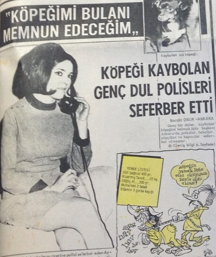 22 Ocak 1969 tarihli bir haberde “Köpeği kaybolan genç dul polisleri seferber etti” başlığı kullanılıyordu. Haberin üst başlığı ise tıpkı başlığı gibi, gazetecilik etiğine rahmet okutur nitelikteydi: “Köpeğimi bulanı memnun edeceğim.”