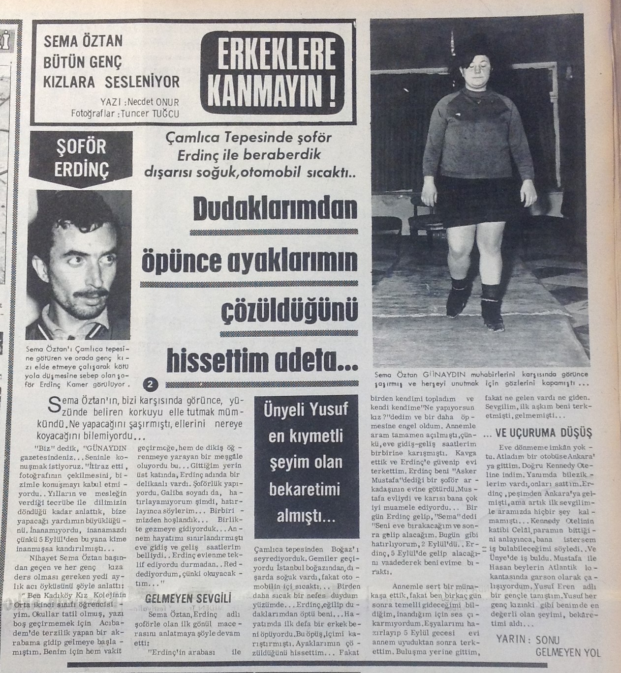 Gazetede, 3 Şubat 1969 tarihinde bir röportaj dikkat çekiyordu. İstanbul’da genç bir kadın, bir şoförle birlikte olmuştu. Röportaja başlık olarak “Dudaklarımdan öpünce ayaklarımın çözüldüğünü hissettim” ifadesi seçilmişti. Röportajı yapan gazeteci Sema Öztan, genç kızlara ‘Erkeklere kanmayın’ diye sesleniyordu.